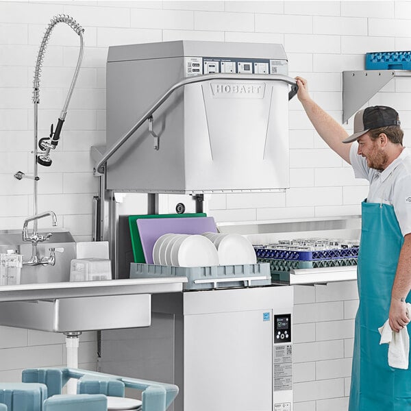 Whether it's a delicate wine glass or a grimy pot, the Hobart high temperature door-style base electric dishwasher can clean them all. This dishwasher comes standard with a Sense-A-Temp 70 degrees Fahrenheit rise, 7.1 kW booster heater to get rinse water up to the necessary temperature to sanitize your dishes. A high temperature unit like this one can be especially helpful for times when you need to reduce the amount of money you spend on chemicals or are concerned about residue from chemical sanitizers affecting the taste of your sensitive foods or beverages.