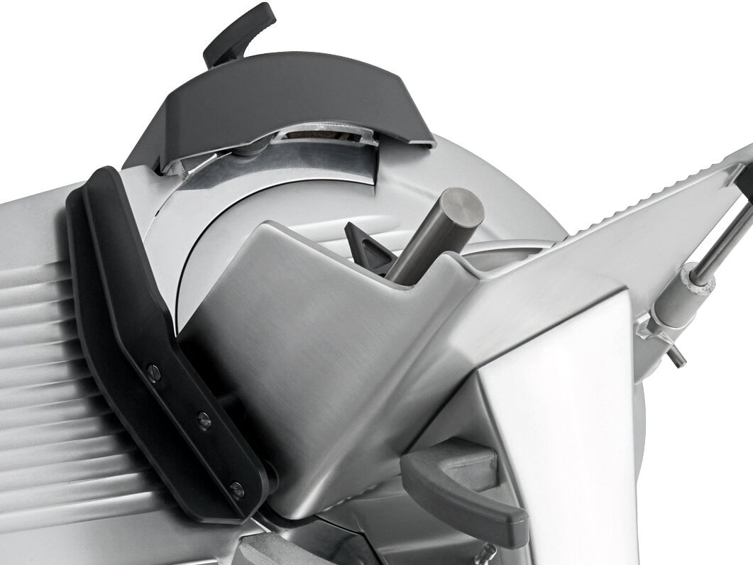 The 13" chrome-plated carbon steel knife offers precision while providing several different slice adjustments. It consistently cuts meat, vegetables, or cheese from paper-thin to 9/16" thick. A top-mounted ceramic sharpener hones and sharpens your knife, ensuring that it's always razor sharp and ready to slice. It accommodates food up to 9 1/2" wide and 6 1/2" tall, or 8" in diameter. A wide, 11 1/2" carriage span allows for a smooth glide. This unit also operates with a 45-degree angle gravity feed that requires less mechanical pressure.