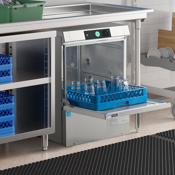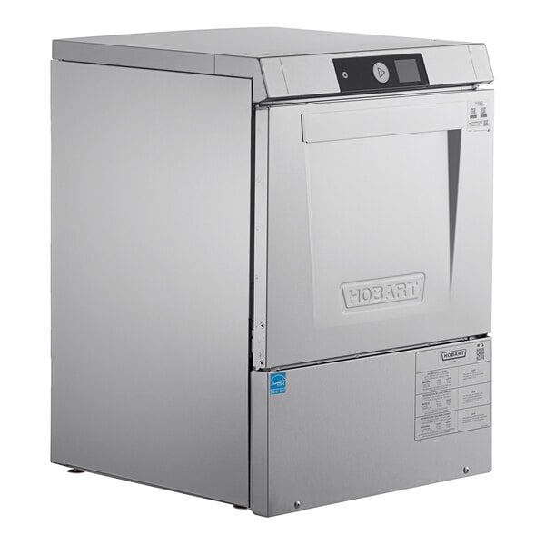 Designed for busy kitchens, the Hobart high-temperature undercounter dishwasher delivers ultimate convenience and reliability. This dishwasher can clean up to 32 racks per hour while using only 0.62 gallons of water for a standard cycle. Equipped with light and normal modes, each cycle begins with a soft start and fills automatically. Featuring a two-level racking capability (kit sold separately), this machine sanitizes with hot water. An integrated Sense-A-Temp booster heater raises the final rinse water temperature by 70 degrees Fahrenheit to 180 degrees Fahrenheit.