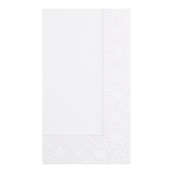 Match the decor of your restaurant or catered event with this stylish and convenient Hoffmaster 15" x 17" white 2-ply regal-embossed 1/8 fold paper dinner napkin! Featuring a strong 2-ply construction, this napkin is sure to keep messes to a minimum in your dining establishment. Its crisp white color and regal-embossed edge design make it an attractive addition to your table settings.