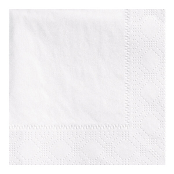 Add a stylish touch to your beverage or appetizer service with this Hoffmaster 9 1/2" square white 2-ply regal-embossed 1/4 fold paper beverage / cocktail napkin! Featuring an attractive crisp white color and an elegant regal-embossed edge design, this napkin is the perfect addition to any bar, restaurant, or catered event. It can be used in place of a coaster as a background to your signature cocktails, or you can keep extras around for spills and other messes.