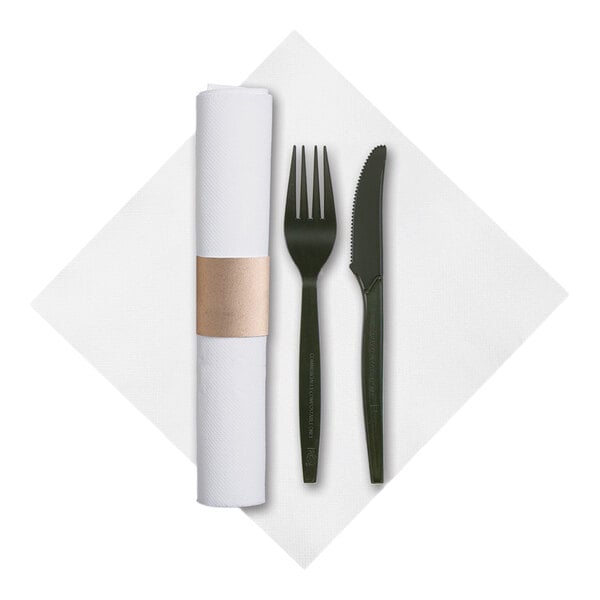 For a convenient yet professional flatware solution, try this Hoffmaster CaterWrap 15 1/2" x 15 1/2" FashnPoint® pre-rolled white napkin and 2-piece compostable black CPLA plastic cutlery set! This cutlery set is pre-rolled and sealed to save you time and effort. This set comes with a black plastic fork and knife. These utensils are rolled in a stylish white napkin, providing the ultimate convenience to both you and your patrons. A kraft strap blends function and style to create a cohesive look and keep this set tightly rolled.
