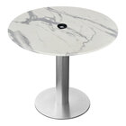 Quick and easy to clean after each use, the internal composite blend and sealed surface and edges are designed to eliminate liquid and moisture absorption. Simply wipe with a damp cloth or mild detergent to remove any spills or burn residue. As stylish as it is convenient, the top features a gorgeous rustic laminate finish that is sure to leave your customers with a lasting impression of your operation. Its smooth satin finish ensures that the tabletop's vibrant colors are long-lasting. The top rests upon a durable brushed aluminum frame with a sturdy, 18" round base. The 4" column of the frame accepts and secures your umbrella pole. Designed for versatility, this frame sports adjustable levelers that ensure protection and stability regardless of floor surface. Once assembled, this table can support a seating capacity of 3-4 people. Provide your guests with a comfortable, attractive place to enjoy your offerings with this Holland Bar Stool standard height table! Assembly is required with this unit.