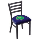 Add a reliable, comfortable seat to virtually any operation while tapping into your guests' fanaticism with this Holland Bar Stool L00418ND-Lep University of Notre Dame chair! Featuring the team's unmistakable leprechaun logo and "Notre Dame Fightin' Irish" on a dark blue background, the design uses a detailed screen print process that produces a sharp, crisp, and clear logo on the vinyl seat cover. The seat itself is padded and combines with an unmistakable ladder style back rest to ensure your guests comfort, whether they're stopping in for a quick bite to eat or staying for an entire game! Thanks to a black powder coated finish and solid welds, the chair's plating grade steel frame supports up to 350 lb. and not only delivers long-lasting performance, but also a sleek aesthetic. A great addition to bars, game rooms, and sports lounges, this ND chair is officially licensed by the NCAA to ensure top-notch quality that's sure to have sports fans cheering "here come the Irish!"