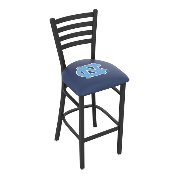 Add a reliable, comfortable seat to virtually any operation while tapping into your guests' fanaticism with this Holland Bar Stool L00430NorCar University of North Carolina chair! Featuring the Tar Heels' unmistakable logo on a bold blue background, the design uses a detailed screen print process that produces a sharp, crisp, and clear logo on the vinyl seat cover. The seat itself is padded and combines with an unmistakable ladder style back rest to ensure your guests comfort, whether they're stopping in for a quick bite to eat or staying for an entire game! Thanks to a black powder coated finish and solid welds, the chair's plating grade steel frame supports up to 350 lb. and not only delivers long-lasting performance, but also a sleek aesthetic. With a 30" seat height, this chair is the perfect complement to bars and bar height pub tables. A great addition to bars, game rooms, and sports lounges, this UNC chair is officially licensed by the NCAA to ensure top-notch quality that's sure to have sports fans cheering "Tar, Heels!"