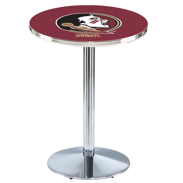 Bolster your guests' fanaticism by enhancing your operation's sports atmosphere with this Holland Bar Stool 30" round Florida State University pub table with chrome round base! Featuring the team's unmistakable logo and "Florida State Seminoles" on a bold garnet background, this table boasts a sublimated laminate top with vibrant colors that are sure to make the design pop. The laminate is attached using an eco-friendly, VOC-free adhesive that is guaranteed to hold, while the top itself rests upon a sleek, chrome tubular steel frame to provide reliable stability and added visual appeal.