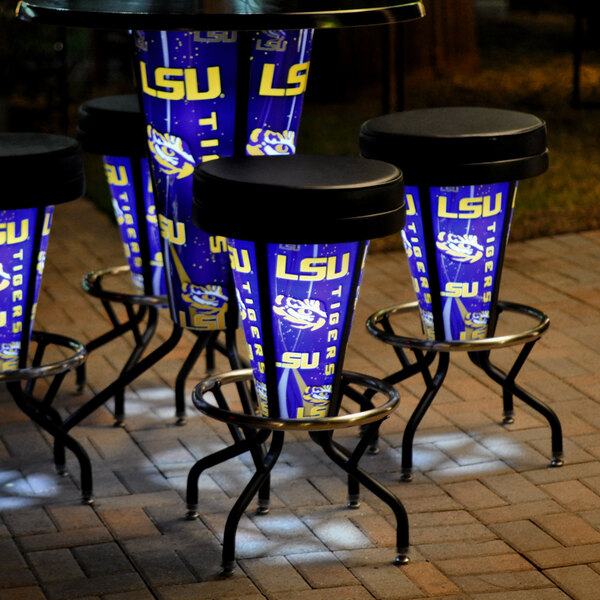 Add a comfortable, eye-catching seat to your operation while bolstering your guests' fanaticism with this Holland Bar Stool L500030LaStUnBlkVinyl Louisiana State University indoor / outdoor LED bar stool! Guaranteed to stand out in dimly lit bars or out on a deck at nighttime, this stool features a rechargeable LED light that illuminates 4 lexan panels which surround the frame and feature an LSU Tigers design. The panels' intricate designs are digitally printed with UV inks for the most vibrant colors possible. A charger is included that permits the light to last up to 12 hours on a single charge and comes with a remote control that allows you to brighten, dim, and choose between 16 different color options. For an added layer of visual intrigue, you can also use flash, strobe, fade, and smooth transitional settings!