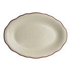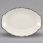 Bring a familiar flair from yesteryear to your table settings with this Homer Laughlin from Steelite International Styleline black 7 3/4" x 5 5/8"oval scalloped china platter. Combining warm, ivory bodies with bold, colored edges, the Styleline collection lends subtle elegance with a vintage touch. This platter is perfect for serving side salads and desserts. While its black lining offers a way to add color contrast to dining areas, the scalloped design lends a wistful overall appearance reminiscent of style trends from decades past. The distinctive scalloped edge makes this Styleline piece a perfect choice for traditional table settings at restaurants, catered events, and banquets!