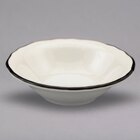 Bring a familiar flair from yesteryear to your table settings with this Homer Laughlin from Steelite International Styleline black 3.75 oz. scalloped china fruit bowl. Combining warm, ivory bodies with bold, colored edges, the Styleline collection lends subtle elegance with a vintage touch. This bowl is perfect for serving freshly cut fruits, dips, sauces, and small sides. While its black lining offers a way to add color contrast to dining areas, the scalloped design lends a wistful overall appearance reminiscent of style trends from decades past. The distinctive scalloped edge makes this Styleline piece a perfect choice for traditional table settings at restaurants, catered events, and banquets!