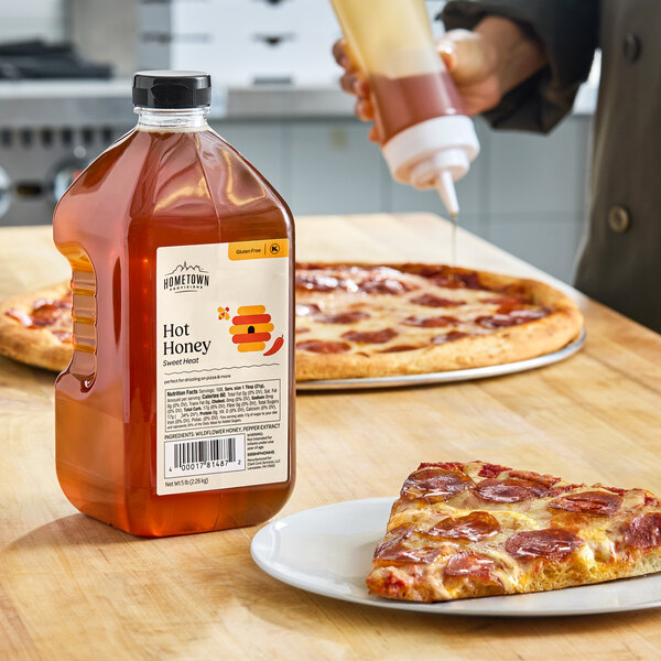 Highly versatile, this hot honey will add a complex flavor profile to condiments, sauces, marinades, and dressings, making it perfect for back-of-house food prep. It makes the perfect complement to a range of savory dishes, from using it to douse crispy fried chicken and tender barbecue or as a drizzle over pizza. It's also great for enhancing roasted vegetables such as Brussels sprouts and sweet potatoes with an added layer of flavor, and it is an unexpected yet mouthwatering pairing with charcuterie, soft cheeses, and french fries. Packaged in an easy-to-grip plastic container, this hot honey is a convenient, bold way to enrich your favorite recipes. For a great value and great taste, stock up on this Hometown Provisions hot honey!