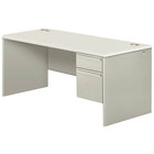 Complete your workspace with this HON 38292LNS 38000 Series mahogany/charcoal metal left pedestal desk. This desk is built to be a good looking, hard working piece of furniture that will last a lifetime in your establishment. Its top is made from durable moisture-, abrasion- and stain-resistant laminate that will withstand scuffs, scrapes, and spills. Additionally, its drawers operate on ball bearing suspensions for smooth rolling. The high-sided file drawer extends fully for complete access and it can accept letter or legal size hanging files. These high sides accept hanging files without hang rails as well. The box drawer extends out three-quarters of the way to help provide counter balance when it is extended.