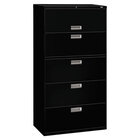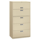Keep your files organized and protected with the HON 685LL 600 Series putty five-drawer lateral file cabinet. Each file cabinet is made from commercial-grade materials to withstand the demands of the busiest office space. The tele-scoping suspension operates on steel ball bearings for heavy-duty strength. To keep the cabinet from tipping over, there is a counterweight and a mechanical interlock that only allows one drawer to be opened at a time. Inside the drawer are adjustable hang rails for side-to-side letter/legal filing.