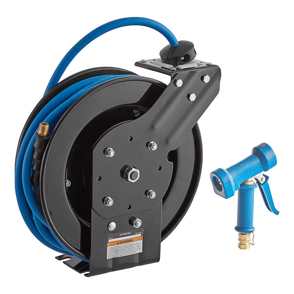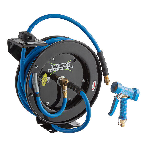 Equip your business with the Regency open powder-coated steel hose reel with a hose and front trigger water gun!