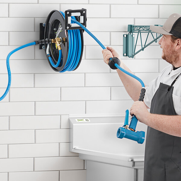 With a multi-fit bracket, the base is built to mount on a wall, ceiling, or floor for convenient access in janitorial locations and commercial kitchens. For versatile use, it is designed for air and water applications. Highly convenient, this spring-driven hose reel can be located precisely where you need it! This model also comes fully equipped for operation with a heavy-duty front trigger water gun.