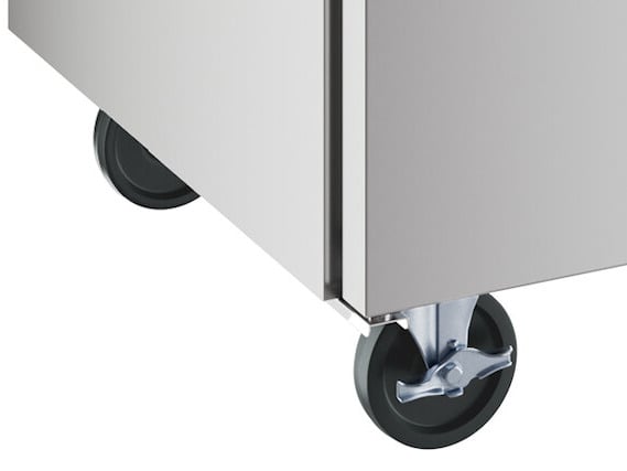 For optimal performance, this sandwich top prep refrigerator comes with 6" casters, two with brakes.