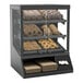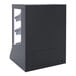 This display case features a sleek black interior and exterior. It has a tempered glass top and sides for extra ambient lighting and product visibility. It offers easy self-service using 2 self-closing, swinging glass doors. This model includes pastry box storage and a tissue box holder. It requires a 120V electrical connection for operation and comes with a power cord.