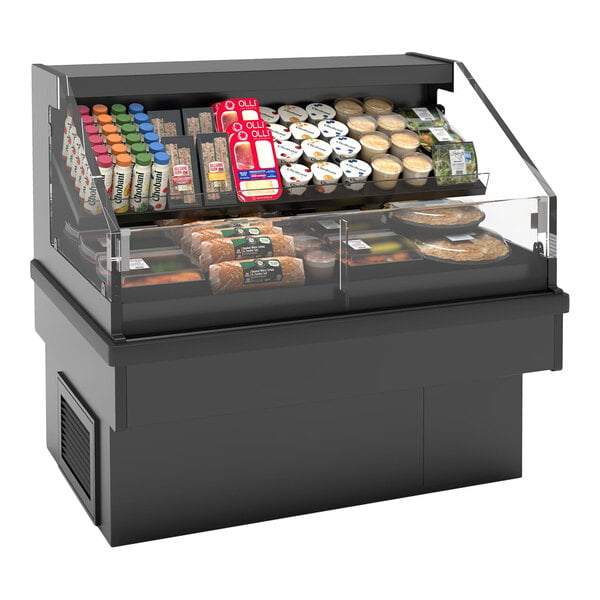 Show off your grab-and-go items with this Hussmann air curtain merchandiser! This self-service merchandiser is ideal for storing promo items such as meat, deli and bakery products, and produce. It features a sleek black interior and exterior with view end panels and a Plexiglass front to showcase your offerings. It includes a deck with an angled, adjustable wire rack and (1) 12" deep shelf. LED lighting on both the shelf and canopy ensure better visibility.