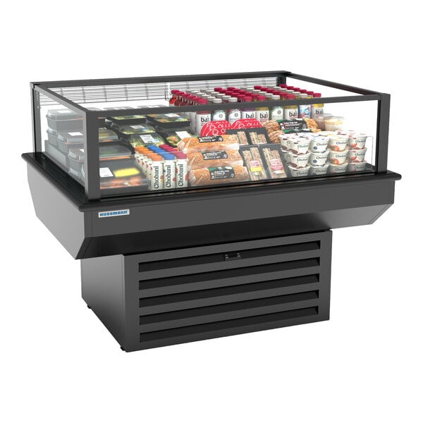 Show off your grab-and-go items with this Hussmann microSC air curtain merchandiser! This self-service merchandiser is ideal for storing refrigerated products such as beverages, dairy and deli items, and produce. It features a sleek black exterior with clear plexiglass panels on all 4 sides. This design offers 360-degree product visibility, helping to draw shoppers' attention. Its large display area has a depth of 10 1/4", allowing it to accommodate a wide variety of products. This unit features 4 casters for easy transport and setup wherever you need it.
