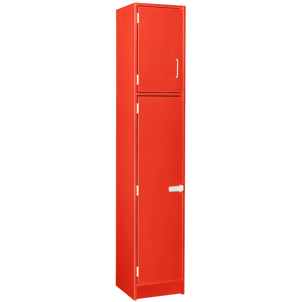Provide a convenient and functional storage solution for employees or students with this I.D. Systems 16" x 18" x 84" tulip red single two door storage locker with adjustable middle shelf 79025 B16 043! This specific model features an attractive tulip red matte finish, making it ideal for break rooms, schools, or employee centers. It is constructed of durable 3/4" thick components with thermofused laminated faces and impact-resistant edges to withstand frequent use. Plus, the laminate surfaces are scuff- and stain-resistant to maintain the locker's appearance.