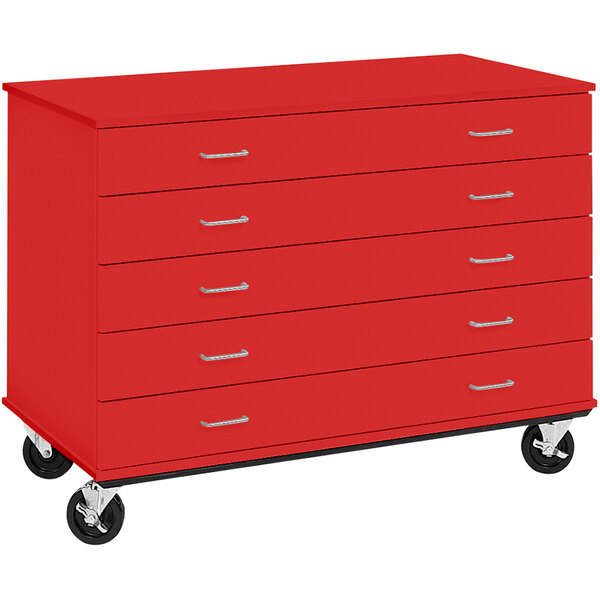 Provide a convenient storage solution for classrooms or offices with this I.D. Systems 24" deep tulip red five drawer mobile storage cabinet 80393F36043. This cabinet includes five full-width drawers on ball bearing slides that are perfect for organizing classwork or supplies. Each smooth-gliding drawer holds paper sizes up to 19" x 43". It is constructed with a durable 3/4" industrial grade wood composite core and features a damage-resistant laminate surface with impact-resistant edges to withstand frequent use. Plus, the non-porous surface resists stains and spills to maintain its appearance.