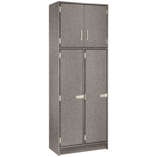 Provide a convenient and functional storage solution for employees or students with this I.D. Systems 30" x 18" x 84" gray nebula double four door storage locker with adjustable middle shelves 79027 B30 059! This specific model features an attractive gray nebula matte finish, making it ideal for break rooms, schools, or employee centers. It is constructed of durable 3/4" thick components with thermofused laminated faces and impact-resistant edges to withstand frequent use. Plus, the laminate surfaces are scuff- and stain-resistant to maintain the locker's appearance.