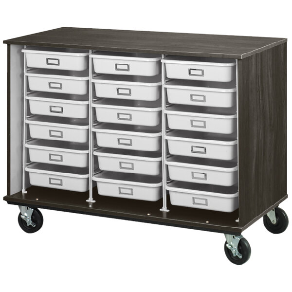 Provide a convenient storage solution for classrooms or offices with this I.D. Systems 36" tall dark elm mobile open storage cabinet 80274Z36020. This cabinet includes (18) 3 1/2" trays that are perfect for organizing office supplies or classwork, and reinforced ribs prevent distortion under heavy weight. It is constructed with a durable 3/4" industrial grade wood composite core and features a damage-resistant laminate surface with impact-resistant edges to withstand frequent use. Plus, the non-porous surface resists stains and spills to maintain the cabinet's appearance.