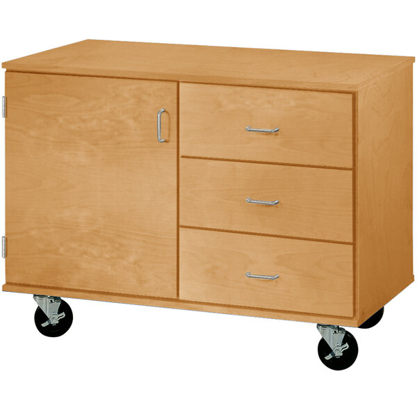 Provide a convenient storage solution for classrooms or offices with this I.D. Systems 36" tall maple mobile storage station with door and drawers 80339F36073. This station includes a large storage area with an adjustable shelf as well as (3) drawers, granting ample space for organizing supplies. It is constructed with a durable 3/4" industrial grade wood composite core and features a damage-resistant laminate surface with impact-resistant edges to withstand frequent use. Plus, the non-porous surface resists stains and spills to maintain its appearance.