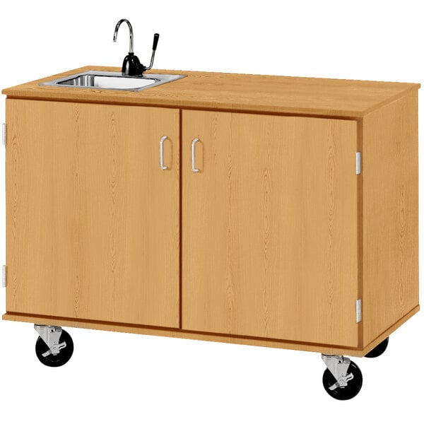 Provide a fun and versatile storage solution for classrooms or offices with this I.D. Systems 48" wide maple demonstration station with sink and (2) storage cabinets 80743F36073. This model features a sink with a gallery pump, making it perfect for classroom experiments, cleanup stations, or even cooking demonstrations! It also includes (2) one-gallon containers for keeping waste water and fresh water separate. The storage cabinets offer ample space for storing tools, utensils, or cleaning supplies. Plus, the solid, hinged doors to the storage cabinets have locks to protect valuables or prevent unwanted access to potentially hazardous materials.