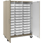 Provide a convenient storage solution for classrooms or offices with this I.D. Systems 67" tall dark elm mobile storage cabinet 80275F67020. This cabinet includes (36) 3 1/2" trays that are perfect for organizing office supplies or classwork, and reinforced ribs prevent distortion under heavy weight. It is constructed with a durable 3/4" industrial grade wood composite core and features a damage-resistant laminate surface with impact-resistant edges to withstand frequent use. Plus, the non-porous surface resists stains and spills to maintain the cabinet's appearance.