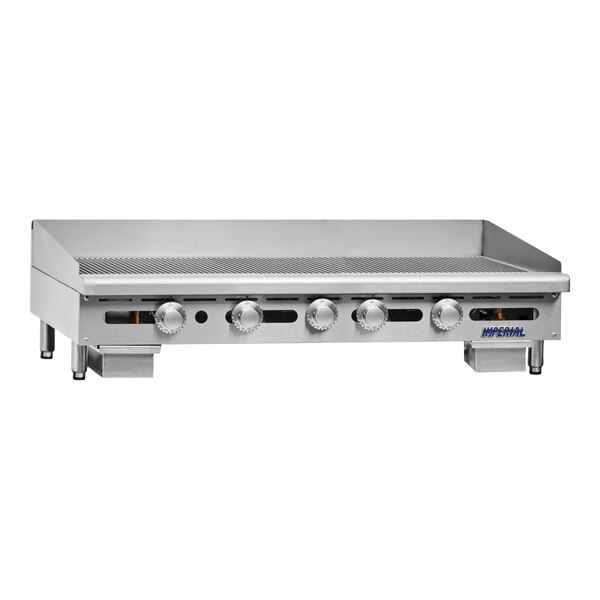 Upgrade your restaurant's grilling capabilities by adding this Imperial Range IGG-60 60" thermostatically controlled natural gas grooved griddle. Designed with a highly-polished, 1" thick steel plate griddle surface, this unit is perfect for cooking a variety of breakfast foods, meats, sandwiches, and other signature menu items! The grooves featured along the plate surface provide the eye-catching appearance of charbroiled marks without the additional step of broiling.