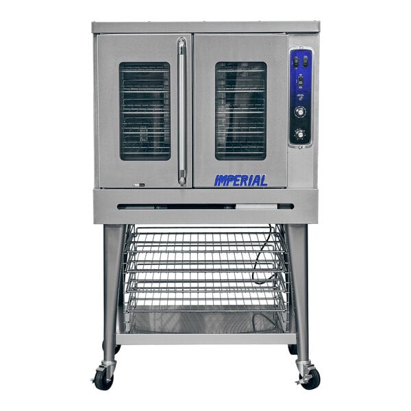 Cooking in your establishment will be easier than ever with this Imperial Range PCVG-1 Pro Series single-deck two-door natural gas convection oven with two-speed motor. This natural gas unit boasts independent time and temperature controls and has a 150-500 degree Fahrenheit temperature range, for maximum versatility when cooking or baking. The two-speed fan is powered by a 1/2 hp motor, and features convenient switch controls that allow you to easily bake or roast various products.