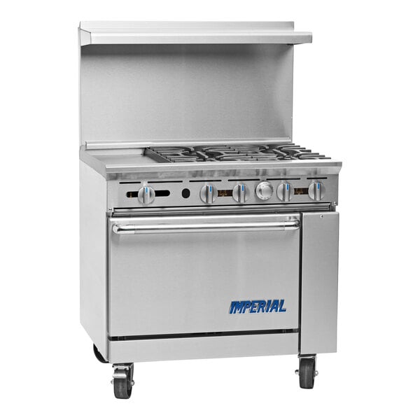 The Imperial Range IR-4-G12 Pro Series 36" liquid propane 4 burner range with 12" griddle and standard oven is designed to be a versatile and efficient addition to your establishment! With 4 cast iron burners, this unit allows you to cook four stock pots or fry pans full of product at the same time. Each 32,000 BTU burner is equipped with exclusive PyroCentric™ anti-clogging technology and is removable for easier cleaning. The burners feature two rings of flame for quick and even heating, as well as a low-simmer feature for versatility when cooking. Each burner has a standing pilot light for instant ignition.