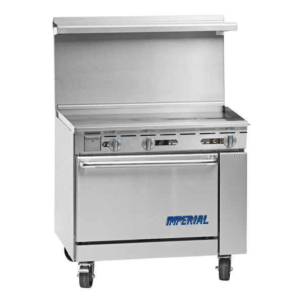 The Imperial Range IR-G36 Pro Series natural gas 36" griddle range with standard oven is designed to be a versatile and efficient addition to your establishment! Eliminate wasted space in your kitchen with the ability to cook or simmer on top while baking or warming on the bottom, since this versatile unit features a griddle top with a standard oven base. The large 36" griddle top is designed with a highly-polished, 3/4" thick steel plate surface, making it perfect for cooking a variety of foods; from pancakes and eggs, to grilled cheese, and even burgers! The griddle burners have an output of 20,000 BTU and heat deflectors are positioned across the griddle section, keeping the temperature even and consistent. The steel construction also provides the unit with excellent heat retention and quick recovery. Plus, this unit features a 3" wide grease trough, large removable grease can, and full-width drip tray for easy cleaning.
