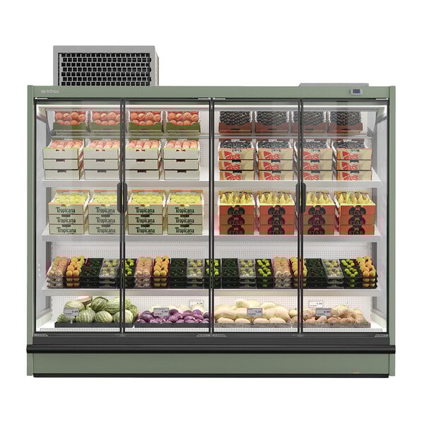 Improve your merchandising with this Infrico refrigerated glass door merchandiser! This sleek, modern unit offers a durable epoxy-painted steel exterior and two full-size double panel glass doors and sides that prevent heat transfer and provide an enticing display for your products. Its modular line design has an enameled steel base with adjustable feet for leveling on uneven surfaces. With built-in LED lighting that illuminates your products and attracts customers' attention, this refrigerated glass door merchandiser is perfect for use in convenience stores, supermarkets, and cafes.
