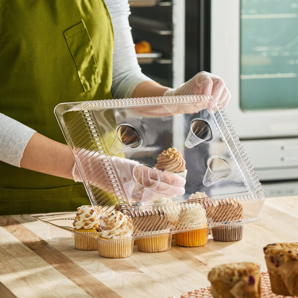 The single-piece clamshell construction of this container is not only sanitary but also stackable for convenient storage. Additionally, this container features a high dome lid to provide ample space for intricate icing patterns or tall decorations. The SureLock double-line lock and bar-lock tabs provide a secure and tight seal, ensuring that your sweet treats stay fresh and protected during transport. Thanks to its reliable, premium design, you can confidently deliver your baked goods to customers without worrying about spills or mishaps. Upgrade your packaging solution and impress your customers with the professional presentation of your cupcakes using this Inline Plastics SureLock container!