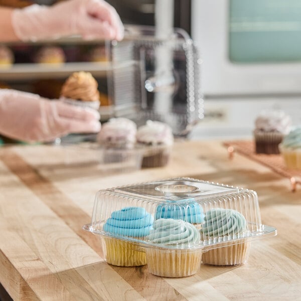 Streamline your bakery packaging process with this Inline Plastics SureLock 4-compartment clear plastic hinged standard cupcake / muffin container with high dome lid! Made from recycled PET plastic, this container is recyclable and made with 10% post-consumer recycled content, making it an eco-friendly choice for your business. This container is designed to hold 4 standard cupcakes or muffins, and its clear construction offers optimal product visibility so you can easily create attractive displays of your baked goods. Whether you run a bakery, grocery store, cafe, or catering business, this versatile container is perfect for showcasing your cupcakes and muffins.