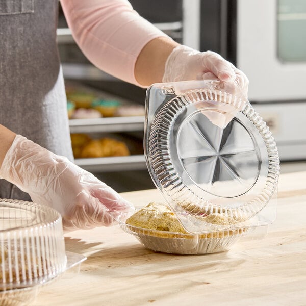 Streamline your bakery packaging process with this Inline Plastic SureLock 6" clear plastic hinged pie container with low dome lid! Made from recycled PET plastic, this container is recyclable and made with 10% post-consumer recycled content, making it an eco-friendly choice for your business. This container is designed to hold a 6" pie, and its clear construction offers optimal product visibility so you can easily create attractive displays of your baked goods. Whether you run a bakery, grocery store, cafe, or catering business, this versatile container is perfect for showcasing your delicious pies.