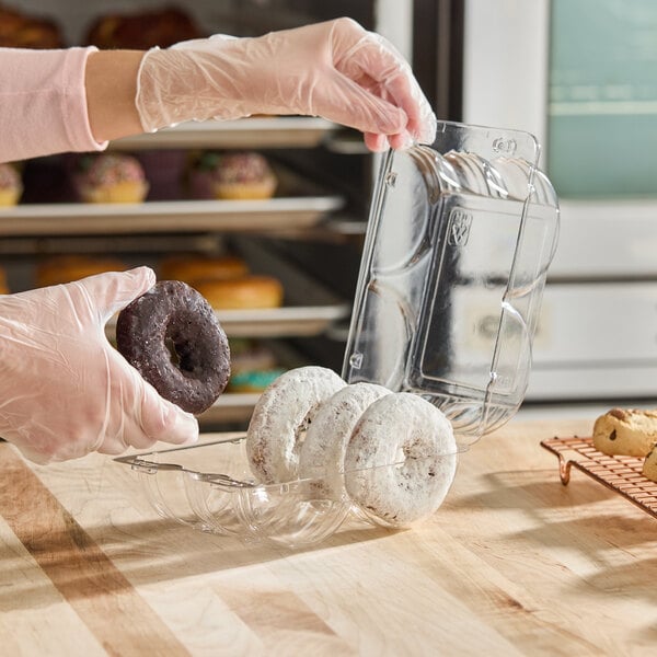 The single-piece clamshell construction of this donut container is not only sanitary but also stackable for convenient storage. The SureLock double-line lock and bar-lock tabs provide a secure and tight seal, ensuring that your sweet treats stay fresh and protected during transport. Thanks to its reliable, premium design, you can confidently deliver your baked goods to customers without worrying about spills or mishaps. Upgrade your packaging solution and impress your customers with the professional presentation of your donuts using this Inline Plastics SureLock container!