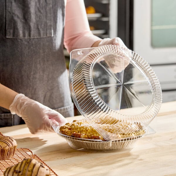 Streamline your bakery packaging process with this Inline Plastic SureLock 9" clear plastic hinged pie container with high dome lid! Made from recycled PET plastic, this container is recyclable and made with 10% post-consumer recycled content, making it an eco-friendly choice for your business. This container is designed to hold a 9" pie, and its clear construction offers optimal product visibility so you can easily create attractive displays of your baked goods. Whether you run a bakery, grocery store, cafe, or catering business, this versatile container is perfect for showcasing your delicious pies.