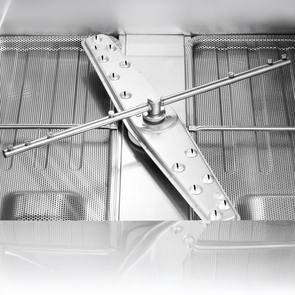 It features rounded tank corners with sound-suppression-lined panels for quiet operation at 63 dBA and revolving, interchangeable stainless steel wash / rinse arms, built-in detergent and rinse aid dispensers, and a dedicated timed de-lime cycle. For ease of use, it features a single-step drain-and-clean system and an automatic pump drain with a removable overflow tube. It combines durable interior and exterior 304 stainless steel construction with high-temperature sanitization for a reliable, easy-to-use dishwashing solution.