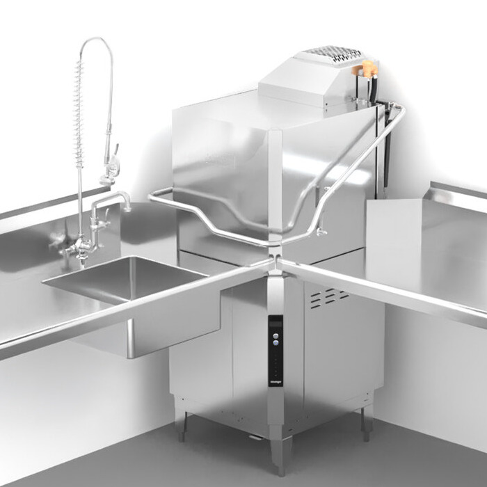 This unit features a quad-arm wash system for full rack coverage, and RackAware rack detection that optimizes water and energy use by automatically sensing when dish racks are present. This ensures that the wash and rinse cycles only activate when needed, significantly reducing water and energy consumption. This item is compatible with select Insinger accessories like additional racks, external panel kits, external steam boosters, a drain quench system, and an additional security package (sold separately). It also features gas springs for the door hood, a door safety switch, a hinged dish rack support, and dish rack guides that nest and lock for rack security.