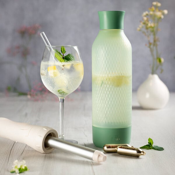 Elevate your everyday beverages with the iSi Twist'N Sparkle Virtuoso 1 liter sage sparkling beverage system!