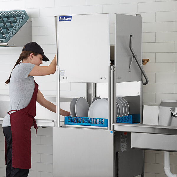 Quickly, easily, and efficiently clean full racks of used dishes with the Jackson TempStar HH-E high temperature door type dish machine! Keeping your dishes and glasses clean is essential to the life of your business, and thanks to this durable unit's 60 second normal washing cycle and 2 hp wash pump, you can successfully clean up to 55 racks per hour using a mere 0.78 gallons of water per rack. This dishwasher features a large, 27" door opening which allows you to wash larger items like full size sheet pans, platters, and 60 qt. mixing bowls! Plus, with its auto-start feature, the washing cycle begins as soon as you close the door.