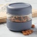 This jar's lid features a threaded design to ensure a secure close and create an airtight seal to keep your goods safe and fresh. Its stylish gray lid and bottom add a modern, minimalist look to any setting. Use this versatile jar to store dry goods or to showcase your offerings in a front-of-house setting.