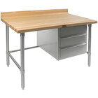 Equip your kitchen with a premium food prep surface with this John Boos & Co. EBSW7R4-3084 wood top enclosed base sliding door work table with stainless steel base and 4" backsplash - 30" x 84". This impressive work table features a 1 3/4" thick, edge-grain northern hard rock maple flat top, ready to take on a variety of foodservice tasks in your commercial kitchen or bakery. The stainless steel enclosed base provides rugged durability for years to come and provides plenty of concealed storage for supplies and tools. The base's construction features 16 gauge, 304 type stainless steel legs and an 18 gauge, 304 type stainless steel shelf and sliding doors that are easily opened with the recessed handles. It features a #4 polish and satin finish for a refined, cohesive appearance. Designed with the needs of professional cooks and bakers in mind, the 4" coved riser on the back helps prevent supplies from spilling or rolling off the back and protects walls.