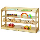 Maximize your classroom storage space with this Jonti-Craft Baltic Birch 1181JCPW 48" x 15" x 28" sideline view wood ridgetop storage cabinet. This unit is an excellent addition to any early learning environment, including daycares, classrooms, Montessori schools, and Head Start facilities! The 2 adjustable shelves and 1 fixed bottom shelf are great for holding toys, blocks, and other educational supplies, while its top features a raised back and sides to contain items on the surface while children use it to play on. Plus, the unit's cut-out side openings make it easier for children to view and pick the items they want without causing any unnecessary messes.