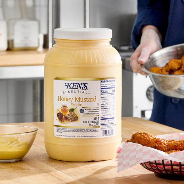 Stock up on this Ken's Foods 1 gallon essentials honey mustard dressing for your salad bar, restaurant, or catered event! This dressing offers the perfect blend of sweet, mild, and savory flavors with a bright color for an eye-catching presentation. Your customers won't be able to resist its mustard and vinegar taste combined with honey. It's great for drenching fried foods like chicken nuggets and fries in a thick and flavorful sauce. It's also perfect for adding a sweet and tangy kick to sandwiches, wraps, and burgers.