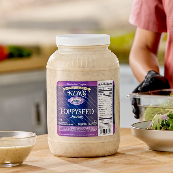 Stock up on this Ken's Foods poppyseed dressing for your salad bar, restaurant, or catered event! This dressing offers the perfect blend of sweet nutty poppy seeds mixed in with vinegar, lemon, onion, garlic, and spices to create a savory flavor profile. The moderately bodied texture is creamy and the perfect addition to your fresh and colorful salads made with ripe vegetables.
