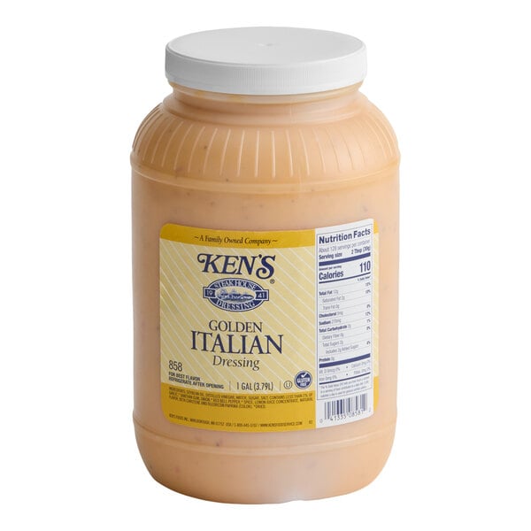 Stock up on this Ken's Foods 1 gallon golden italian dressing for your salad bar, restaurant, or catered event! Featuring fresh ingredients and zesty spices, this dressing is a quick and easy way to enhance flavor in your dishes. It has a full bodied, creamy texture and a bright golden color for an eye-catching presentation your customers will love. Use this smooth dressing with a lemon flavor in savory sauces, meat marinades, salads, or wraps.