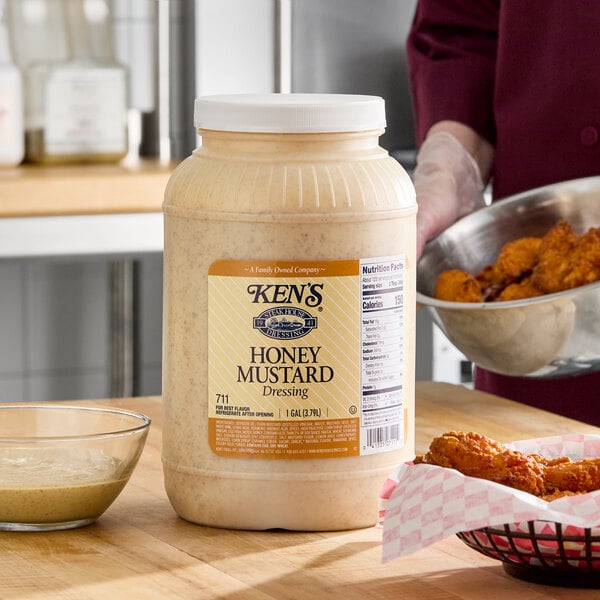Stock up on this Ken's Foods 1 gallon honey mustard dressing for your salad bar, restaurant, or catered event! This dressing offers the perfect blend of sweet, mild, and savory flavors. Your customers won't be able to resist its mustard and vinegar taste combined with honey. It's great for dipping fried foods like chicken nuggets and fries in a thick and flavorful sauce. It's also perfect for adding a sweet and tangy kick to sandwiches, wraps, and burgers.